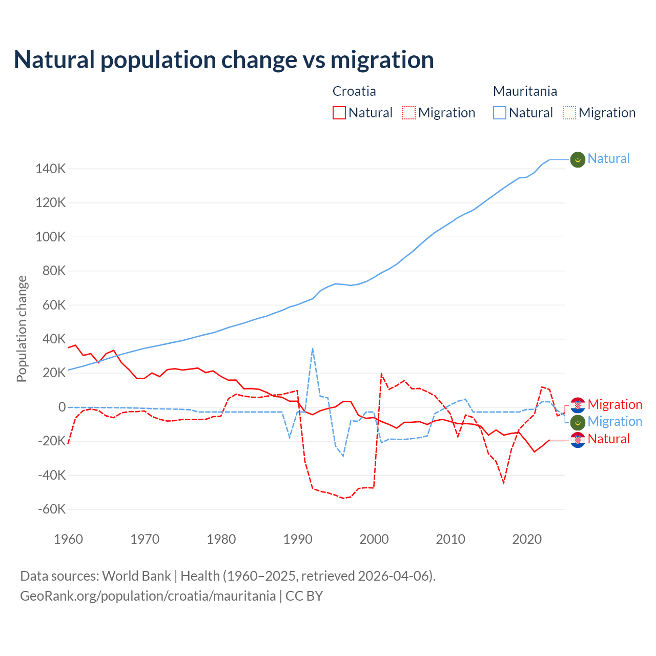 Over the last 10 years, 54.8% of the population change in Croatia is from natural causes (a loss of 177,803 people) and 45.2% is from migration (a loss of 146,770 people). In Mauritania 98.9% is from natural causes (a gain of 1,320,903 people) and 1.12% is from migration (a loss of 14,982 people).