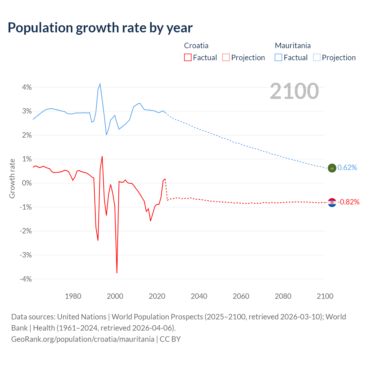 - For the last 10 years, Croatia has had an average growth rate of -0.82% per year vs +3% in Mauritania.