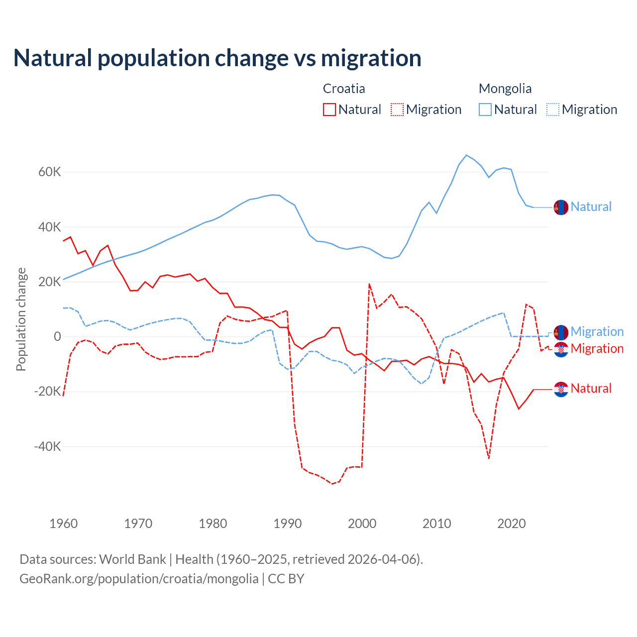 Over the last 10 years, 54.8% of the population change in Croatia is from natural causes (a loss of 177,803 people) and 45.2% is from migration (a loss of 146,770 people). In Mongolia 94.1% is from natural causes (a gain of 580,367 people) and 5.87% is from migration (a gain of 36,163 people).
