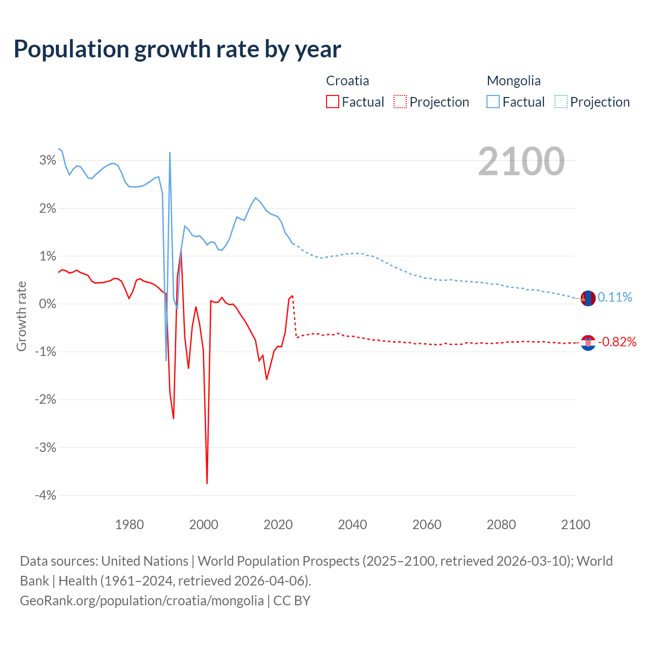 - For the last 10 years, Croatia has had an average growth rate of -0.82% per year vs +1.79% in Mongolia.