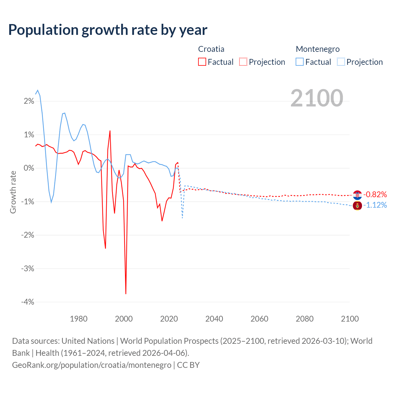 - For the last 10 years, Croatia has had an average growth rate of -0.82% per year vs +0.01% in Montenegro.