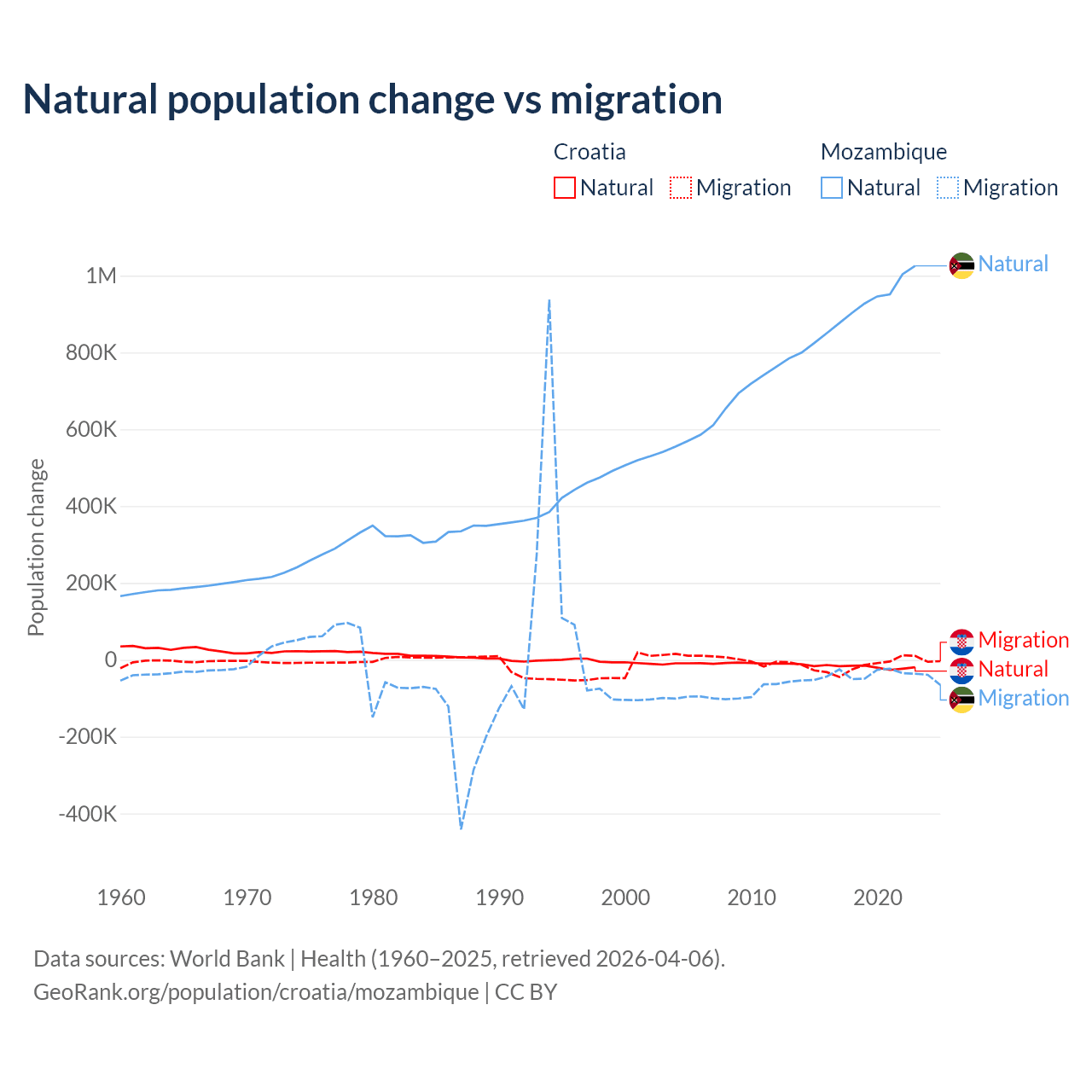 Over the last 10 years, 54.8% of the population change in Croatia is from natural causes (a loss of 177,803 people) and 45.2% is from migration (a loss of 146,770 people). In Mozambique 95.9% is from natural causes (a gain of 9,108,203 people) and 4.15% is from migration (a loss of 393,923 people).