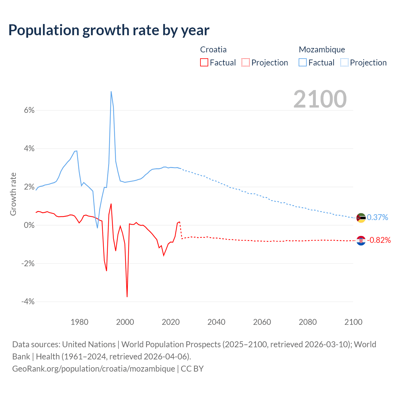 - For the last 10 years, Croatia has had an average growth rate of -0.82% per year vs +2.99% in Mozambique.
