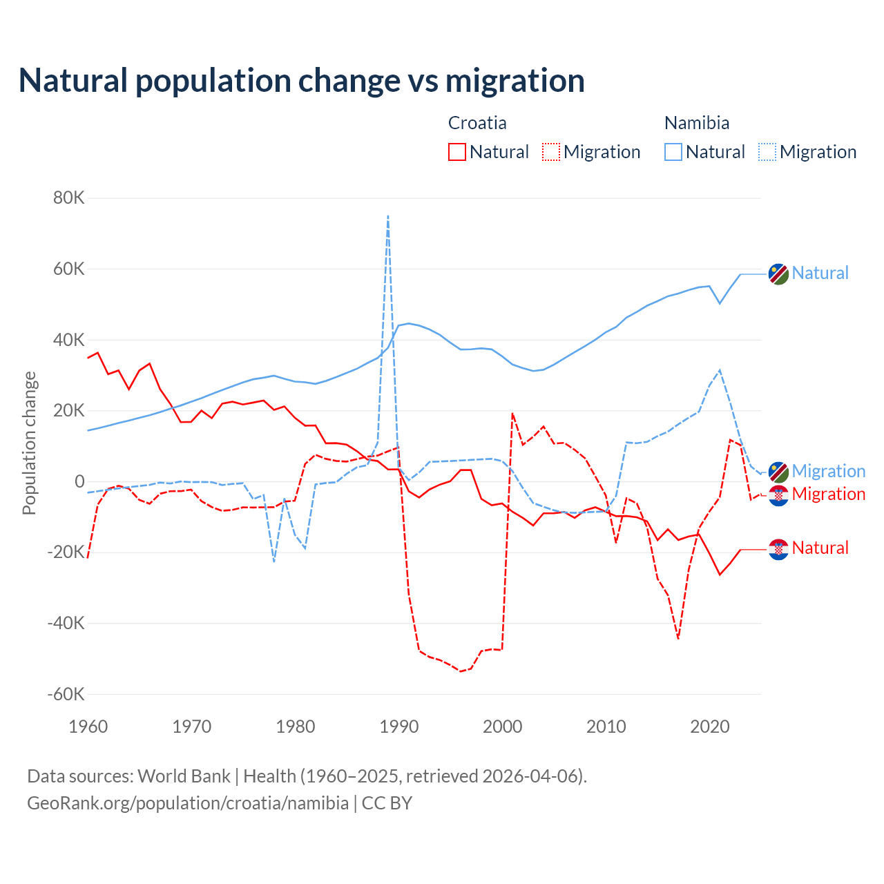 Over the last 10 years, 54.8% of the population change in Croatia is from natural causes (a loss of 177,803 people) and 45.2% is from migration (a loss of 146,770 people). In Namibia 74.3% is from natural causes (a gain of 532,532 people) and 25.7% is from migration (a gain of 183,837 people).