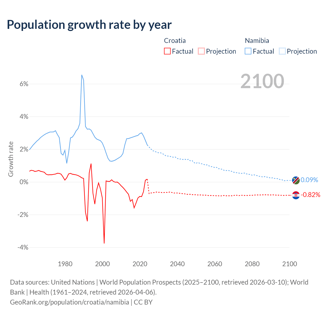 - For the last 10 years, Croatia has had an average growth rate of -0.82% per year vs +2.73% in Namibia.