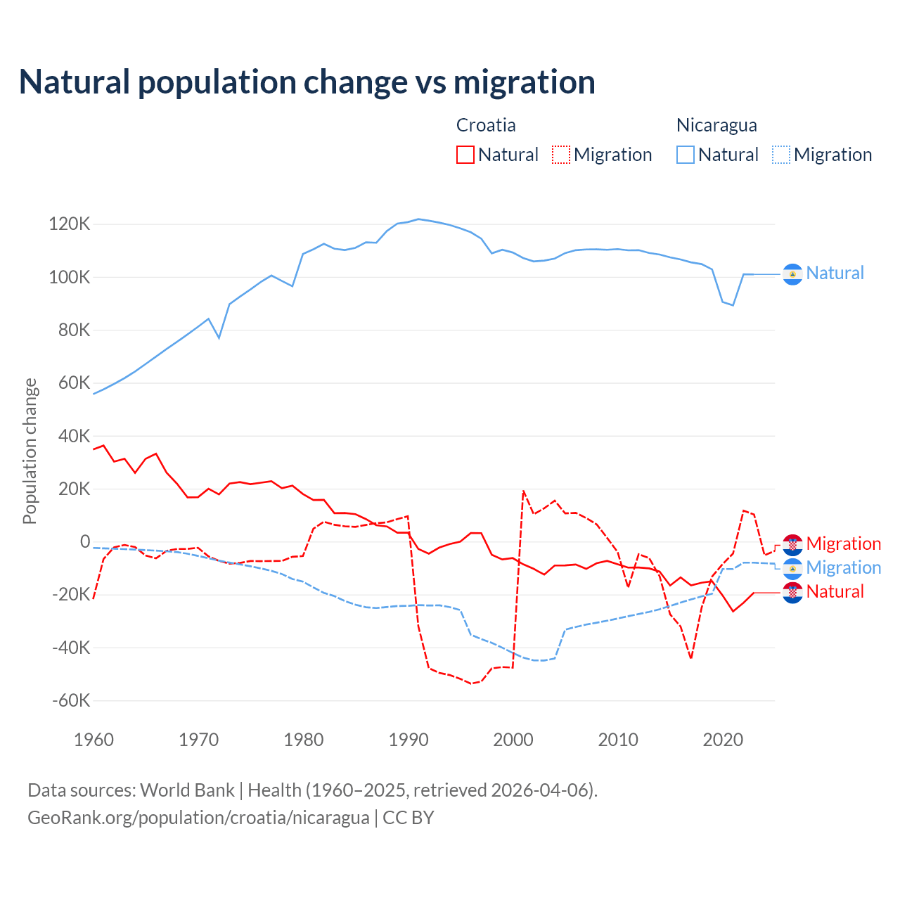 Over the last 10 years, 54.8% of the population change in Croatia is from natural causes (a loss of 177,803 people) and 45.2% is from migration (a loss of 146,770 people). In Nicaragua 85.5% is from natural causes (a gain of 1,017,084 people) and 14.5% is from migration (a loss of 172,078 people).