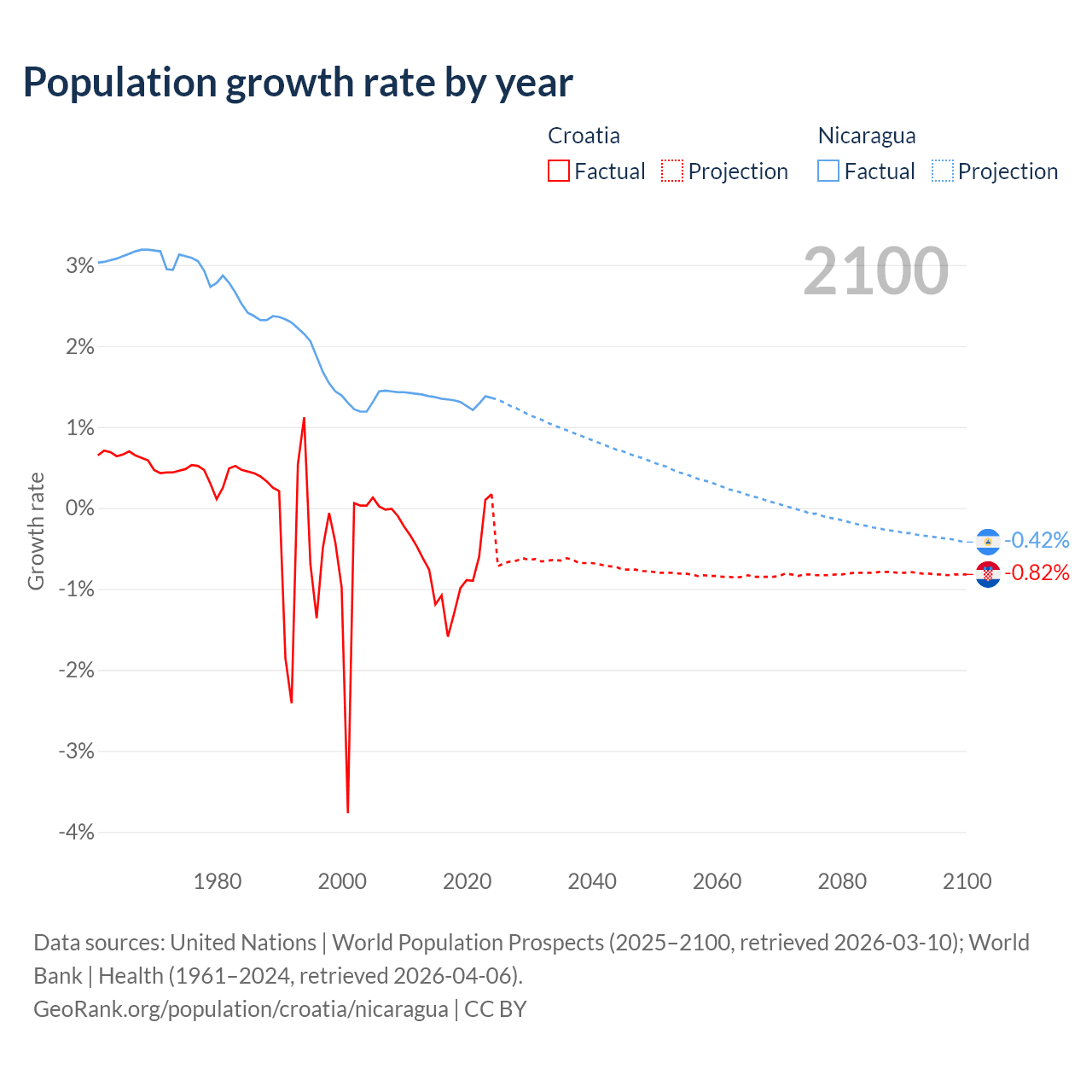 - For the last 10 years, Croatia has had an average growth rate of -0.82% per year vs +1.33% in Nicaragua.