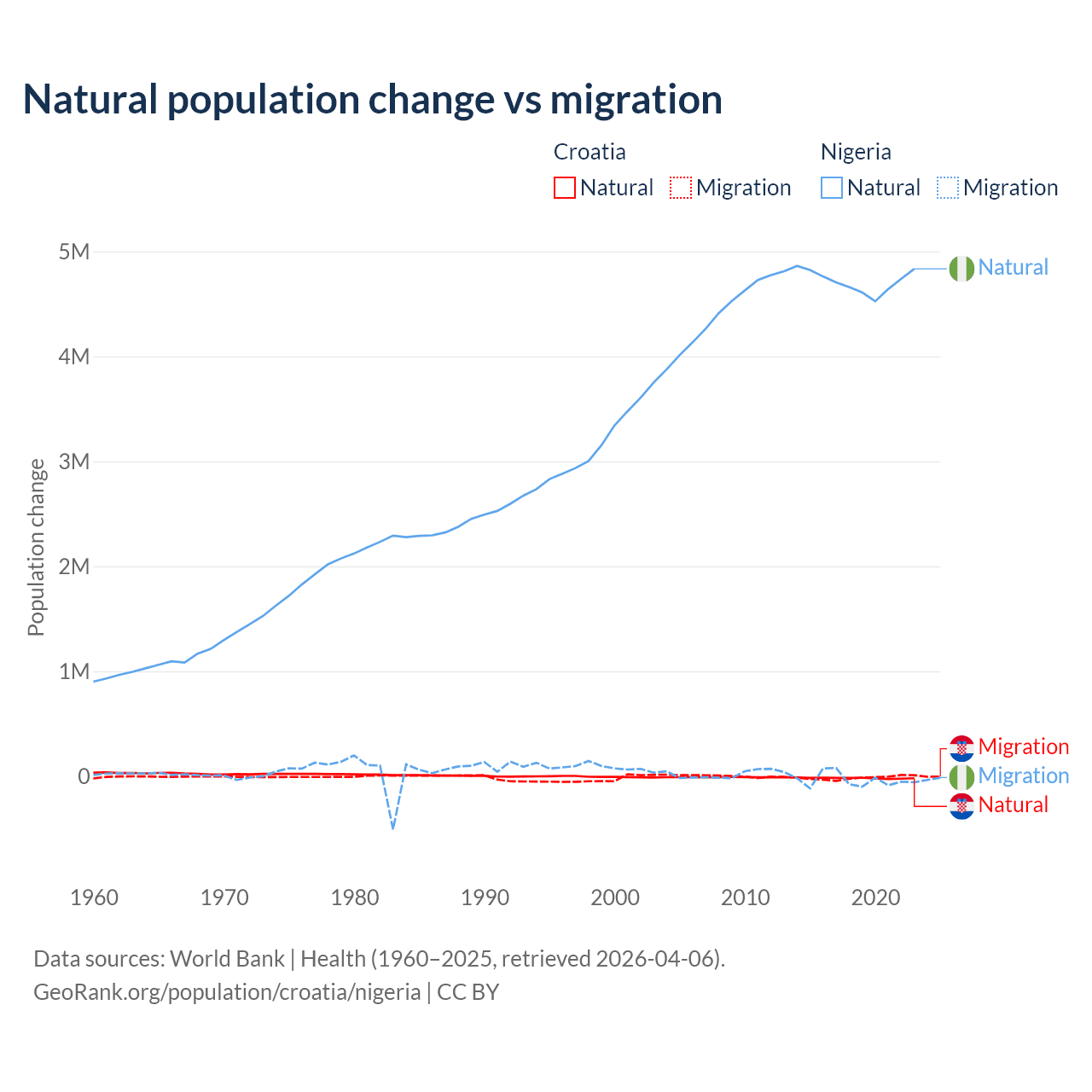 Over the last 10 years, 54.8% of the population change in Croatia is from natural causes (a loss of 177,803 people) and 45.2% is from migration (a loss of 146,770 people). In Nigeria 99.2% is from natural causes (a gain of 47,163,517 people) and 0.77% is from migration (a loss of 368,103 people).