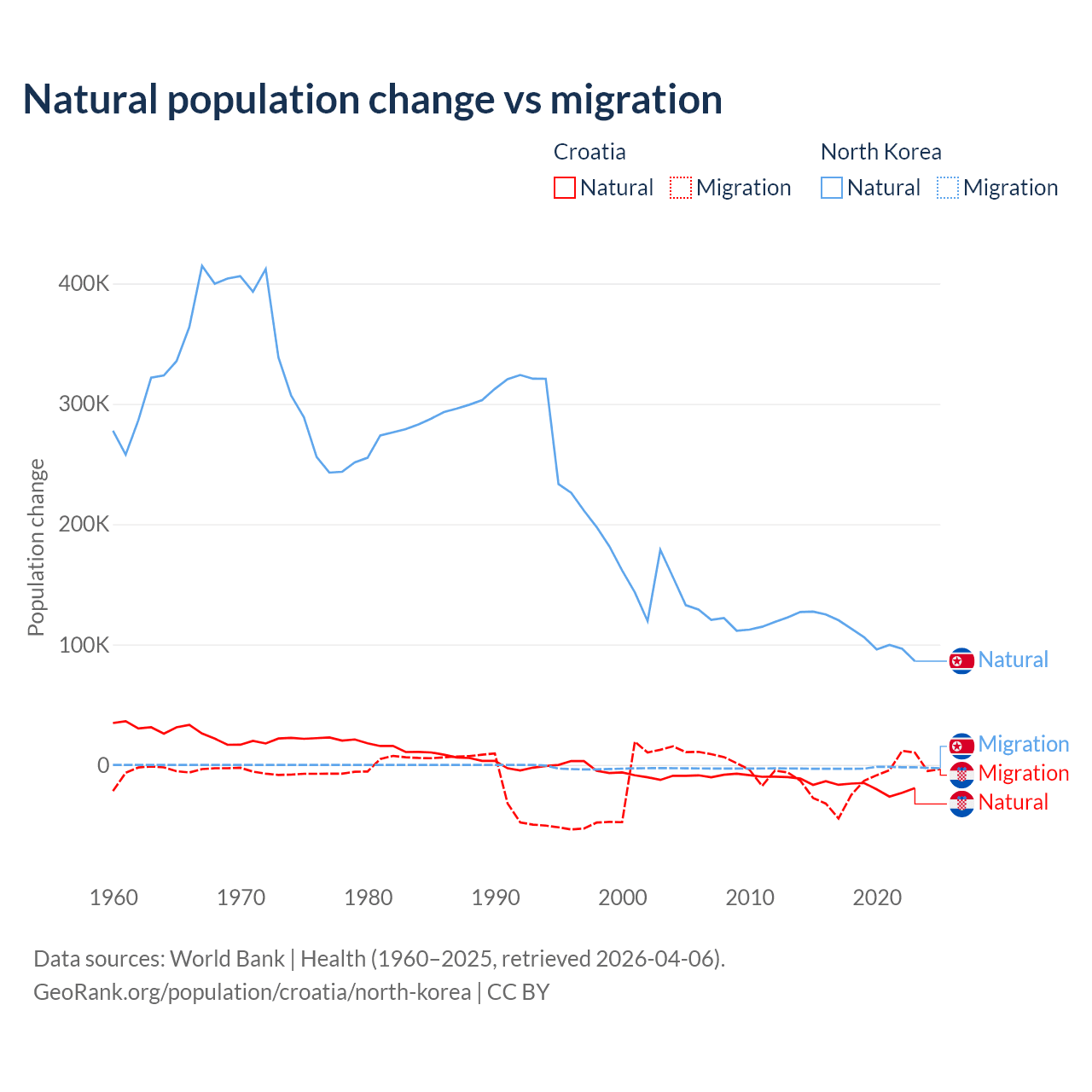 Over the last 10 years, 54.8% of the population change in Croatia is from natural causes (a loss of 177,803 people) and 45.2% is from migration (a loss of 146,770 people). In North Korea 97.7% is from natural causes (a gain of 1,097,372 people) and 2.33% is from migration (a loss of 26,227 people).