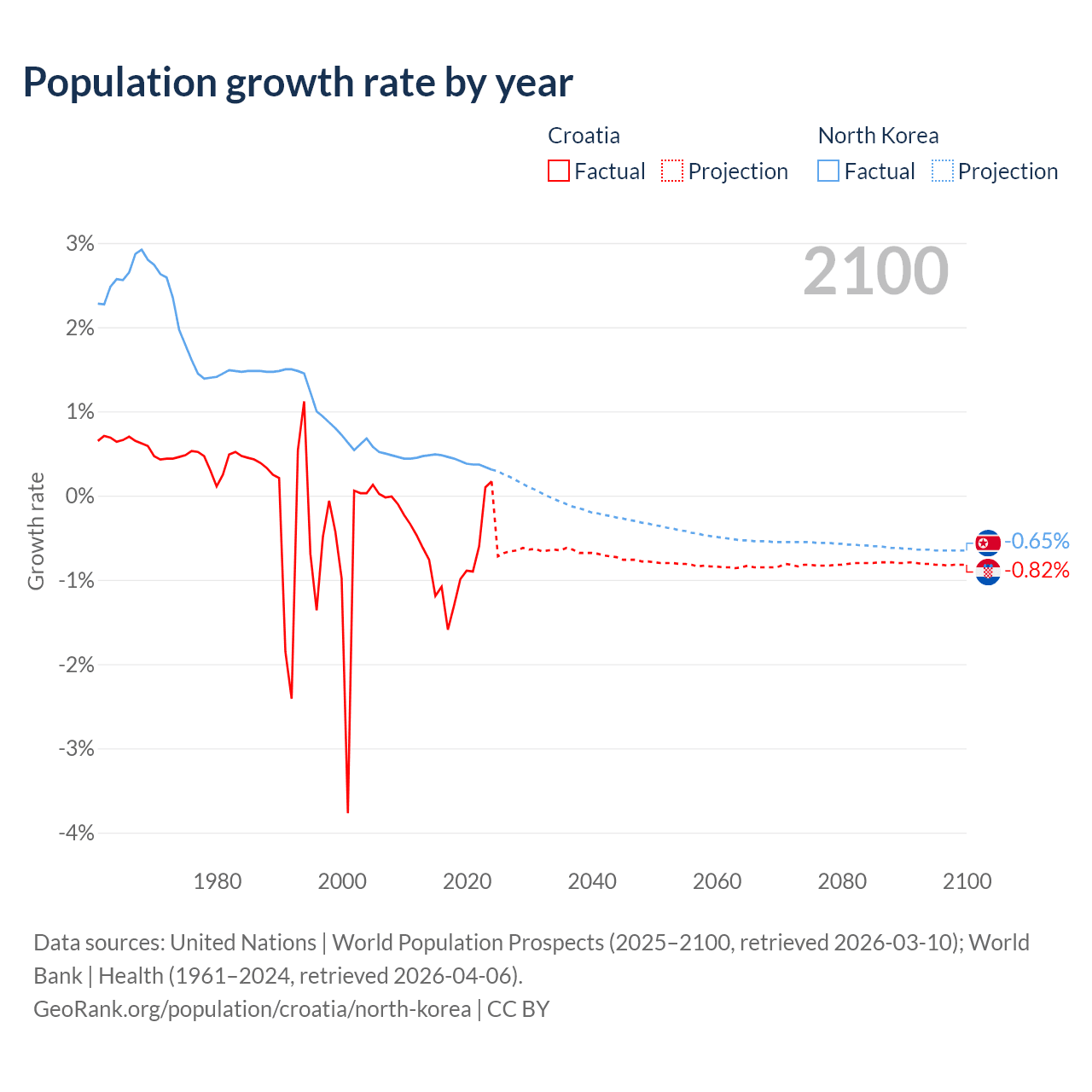 - For the last 10 years, Croatia has had an average growth rate of -0.82% per year vs +0.41% in North Korea.