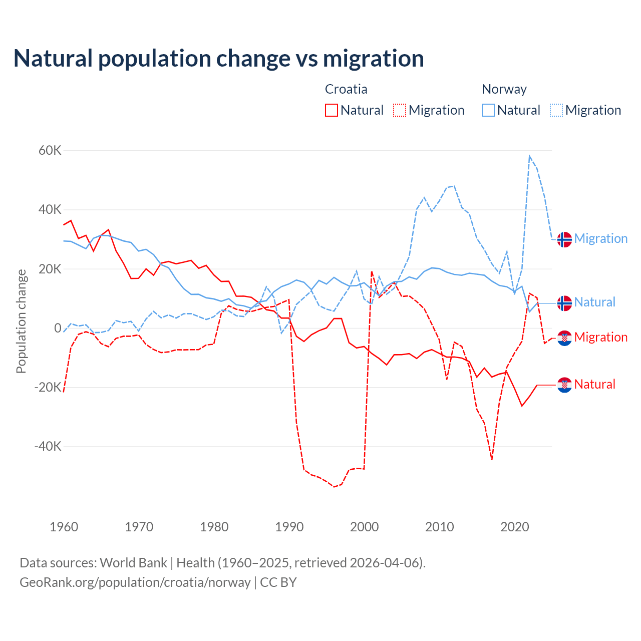 Over the last 10 years, 54.8% of the population change in Croatia is from natural causes (a loss of 177,803 people) and 45.2% is from migration (a loss of 146,770 people). In Norway 31.3% is from natural causes (a gain of 138,699 people) and 68.7% is from migration (a gain of 303,945 people).
