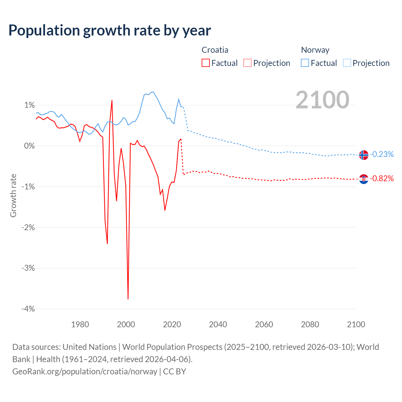 - For the last 10 years, Croatia has had an average growth rate of -0.82% per year vs +0.85% in Norway.