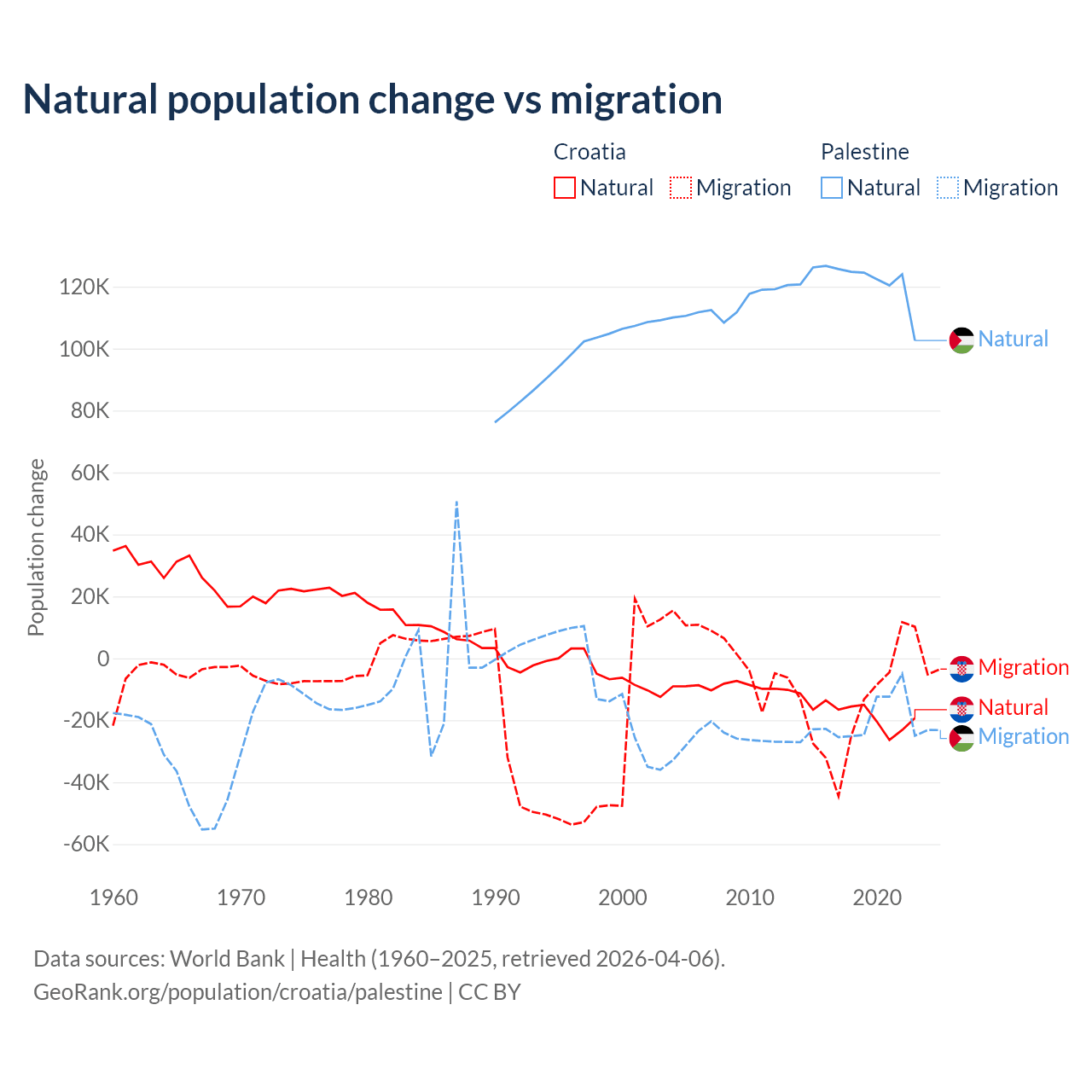 Over the last 10 years, 54.8% of the population change in Croatia is from natural causes (a loss of 177,803 people) and 45.2% is from migration (a loss of 146,770 people). In Palestine 85.7% is from natural causes (a gain of 1,218,010 people) and 14.3% is from migration (a loss of 202,820 people).