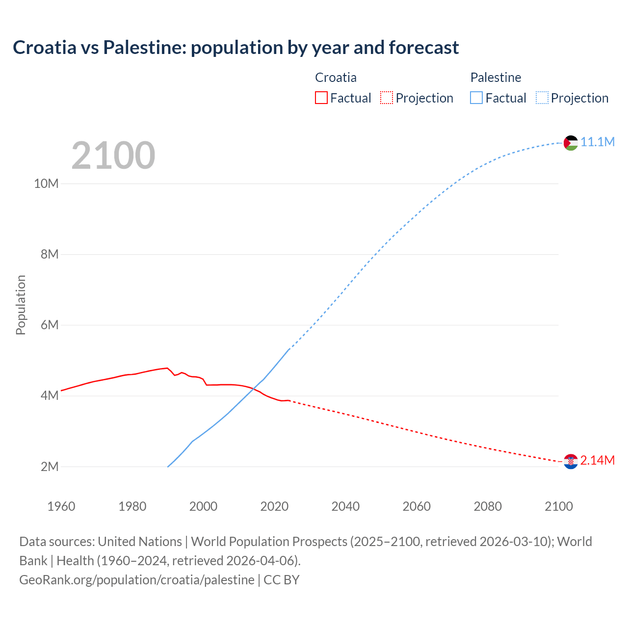 The latest officially reported population of Croatia was 3,866,200 in 2024 vs 5,289,152 people in Palestine in 2024. In 2026, based on the adjusted UN estimation, the current Croatia's population is 3,812,193 people compared to 5,500,288 in Palestine.