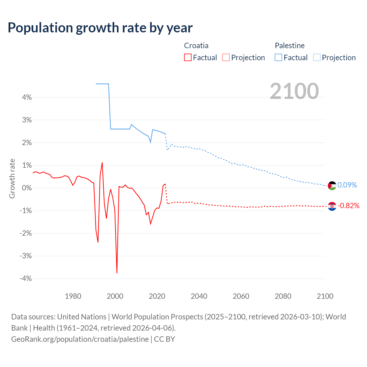 - For the last 10 years, Croatia has had an average growth rate of -0.82% per year vs +2.4% in Palestine.