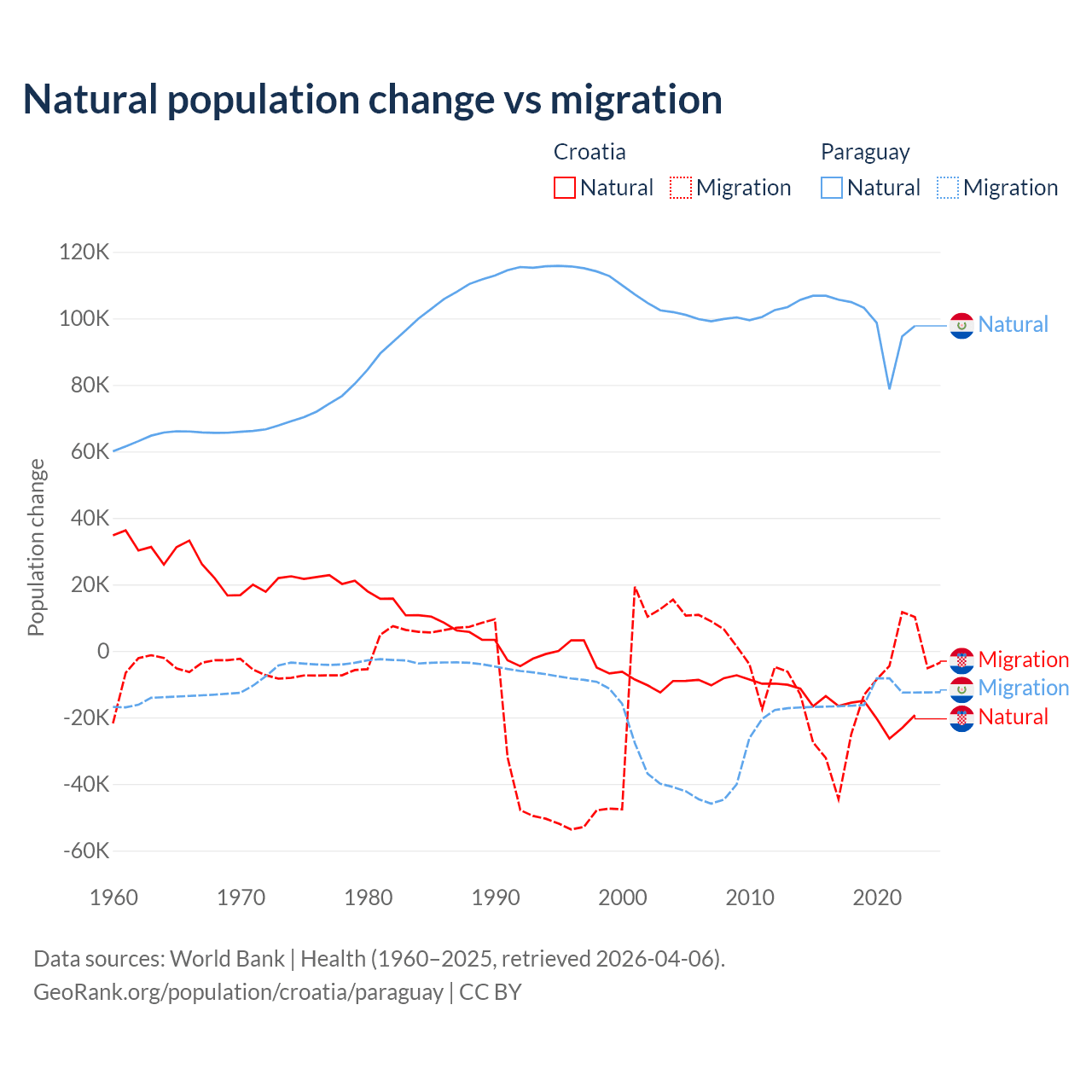 Over the last 10 years, 54.8% of the population change in Croatia is from natural causes (a loss of 177,803 people) and 45.2% is from migration (a loss of 146,770 people). In Paraguay 87.6% is from natural causes (a gain of 1,002,636 people) and 12.4% is from migration (a loss of 141,377 people).