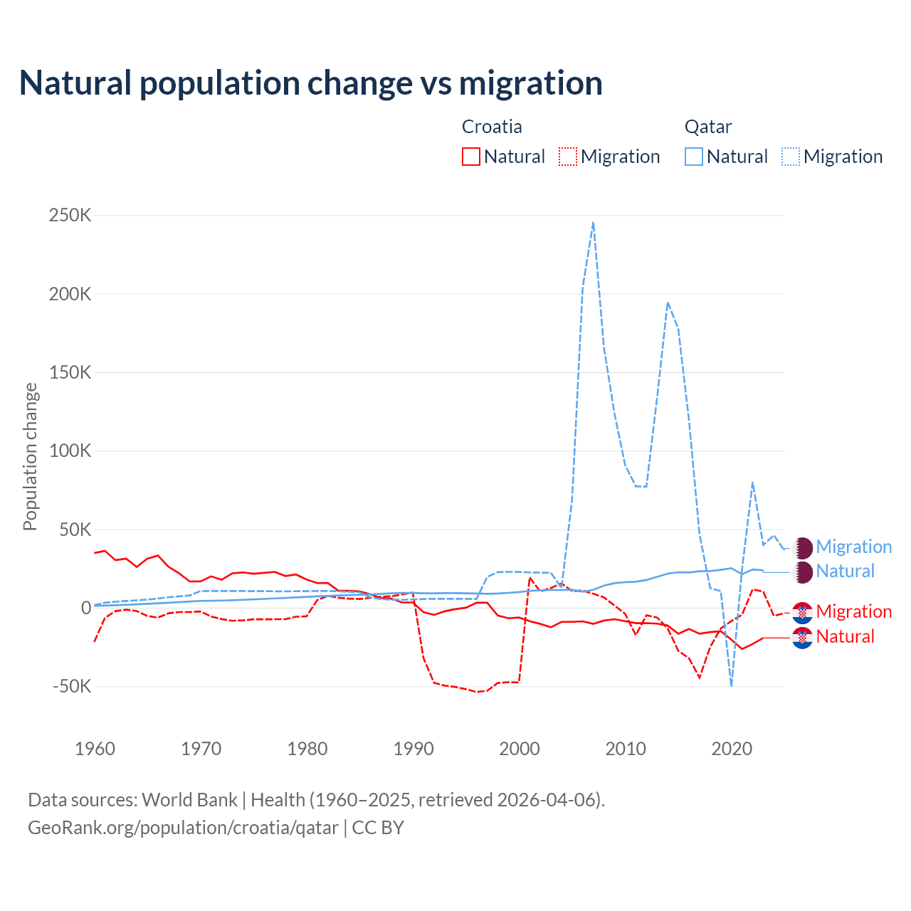 Over the last 10 years, 54.8% of the population change in Croatia is from natural causes (a loss of 177,803 people) and 45.2% is from migration (a loss of 146,770 people). In Qatar 26.1% is from natural causes (a gain of 232,009 people) and 73.9% is from migration (a gain of 655,712 people).