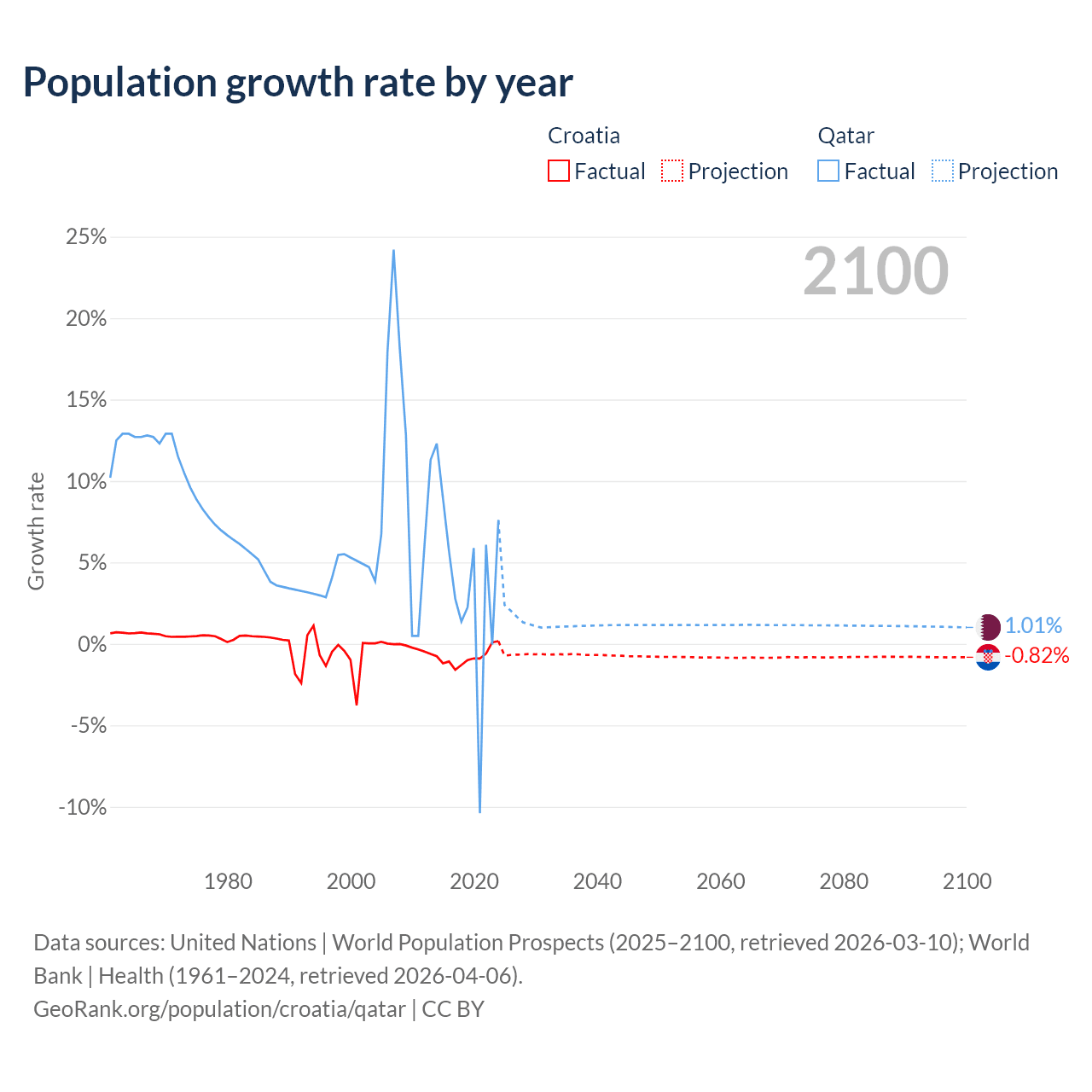 - For the last 10 years, Croatia has had an average growth rate of -0.82% per year vs +3.86% in Qatar.
