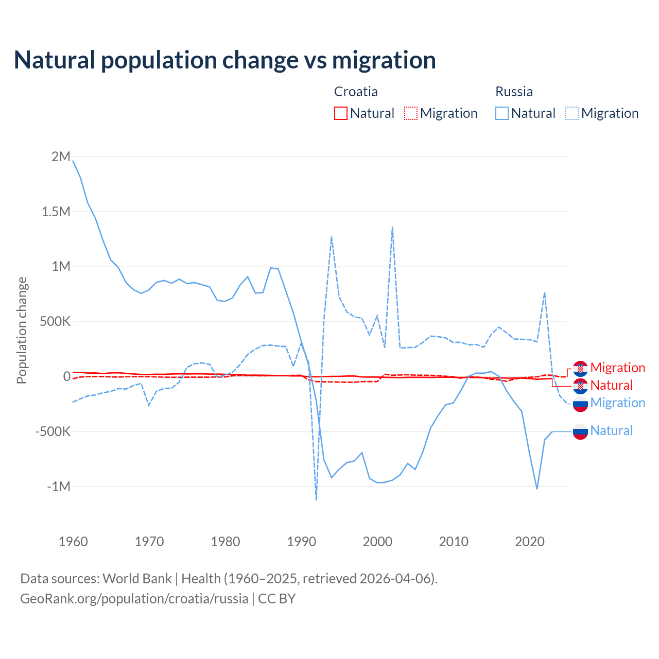 Over the last 10 years, 54.8% of the population change in Croatia is from natural causes (a loss of 177,803 people) and 45.2% is from migration (a loss of 146,770 people). In Russia 48.6% is from natural causes (a loss of 3,416,377 people) and 51.4% is from migration (a gain of 3,611,826 people).