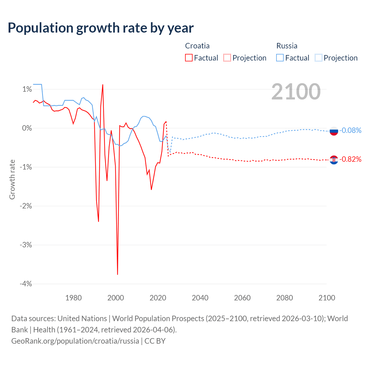 - For the last 10 years, Croatia has had an average growth rate of -0.82% per year vs -0.02% in Russia.