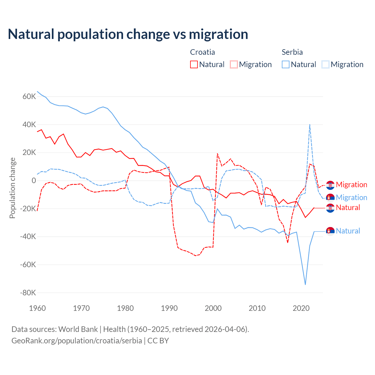 Over the last 10 years, 54.8% of the population change in Croatia is from natural causes (a loss of 177,803 people) and 45.2% is from migration (a loss of 146,770 people). In Serbia 83.3% is from natural causes (a loss of 435,148 people) and 16.7% is from migration (a loss of 87,110 people).