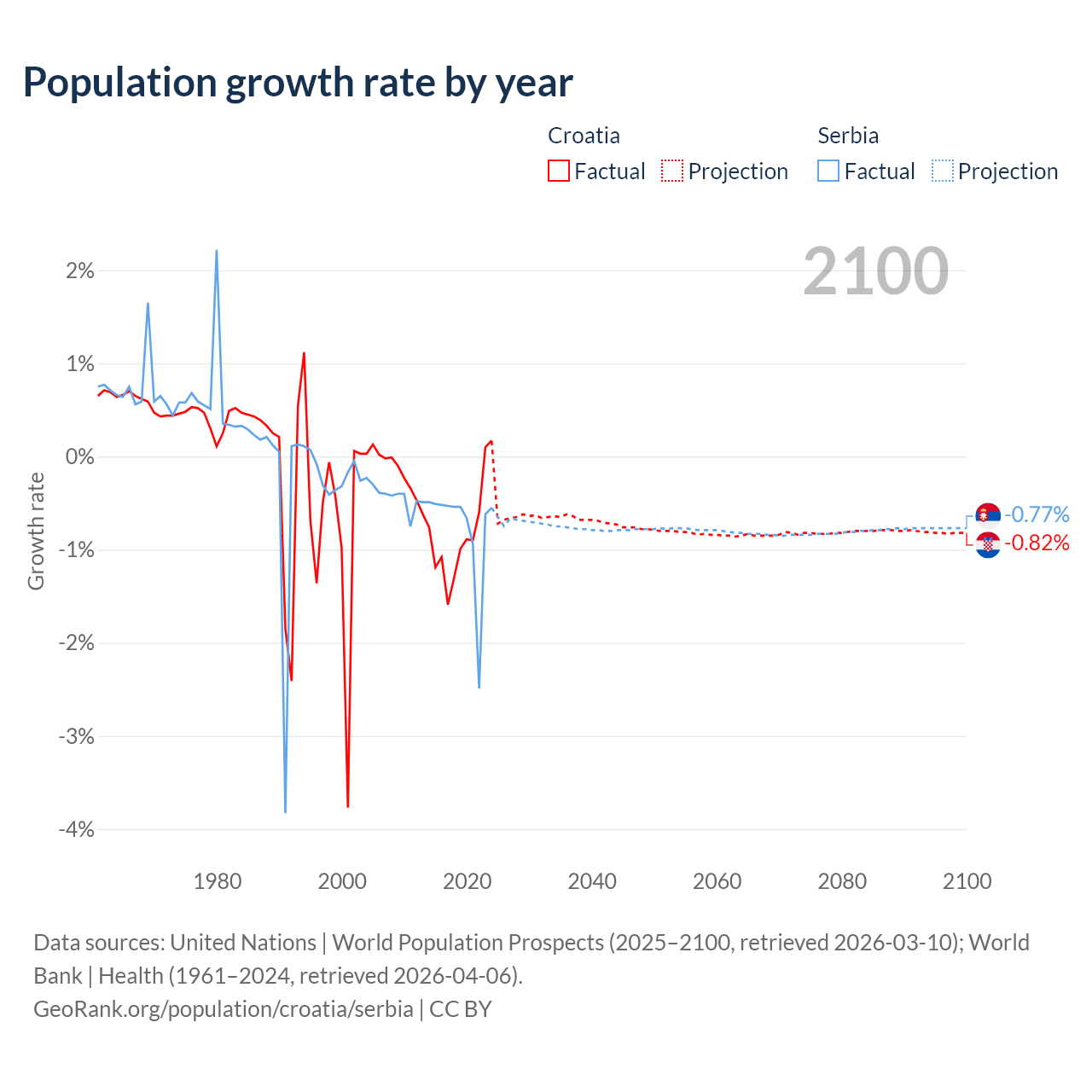 - For the last 10 years, Croatia has had an average growth rate of -0.82% per year vs -0.76% in Serbia.