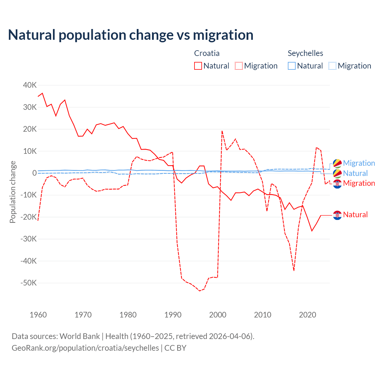 Over the last 10 years, 54.8% of the population change in Croatia is from natural causes (a loss of 177,803 people) and 45.2% is from migration (a loss of 146,770 people). In the Seychelles 31.4% is from natural causes (a gain of 8,122 people) and 68.6% is from migration (a gain of 17,748 people).