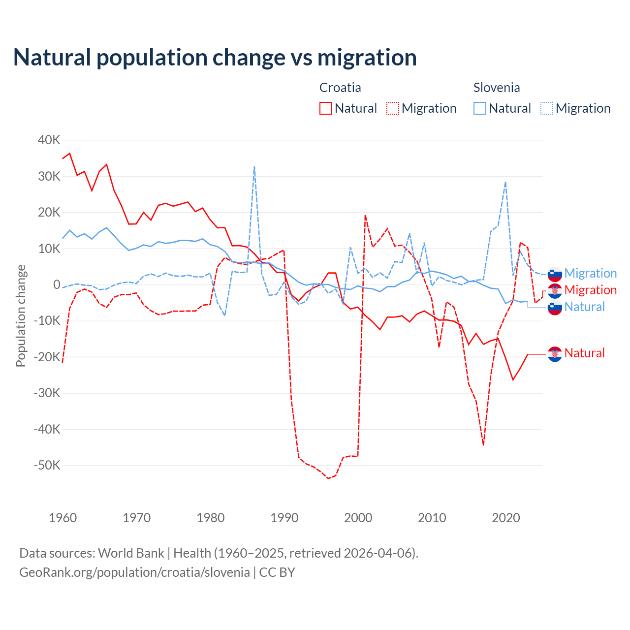 Over the last 10 years, 54.8% of the population change in Croatia is from natural causes (a loss of 177,803 people) and 45.2% is from migration (a loss of 146,770 people). In Slovenia 18.1% is from natural causes (a loss of 17,573 people) and 81.9% is from migration (a gain of 79,532 people).