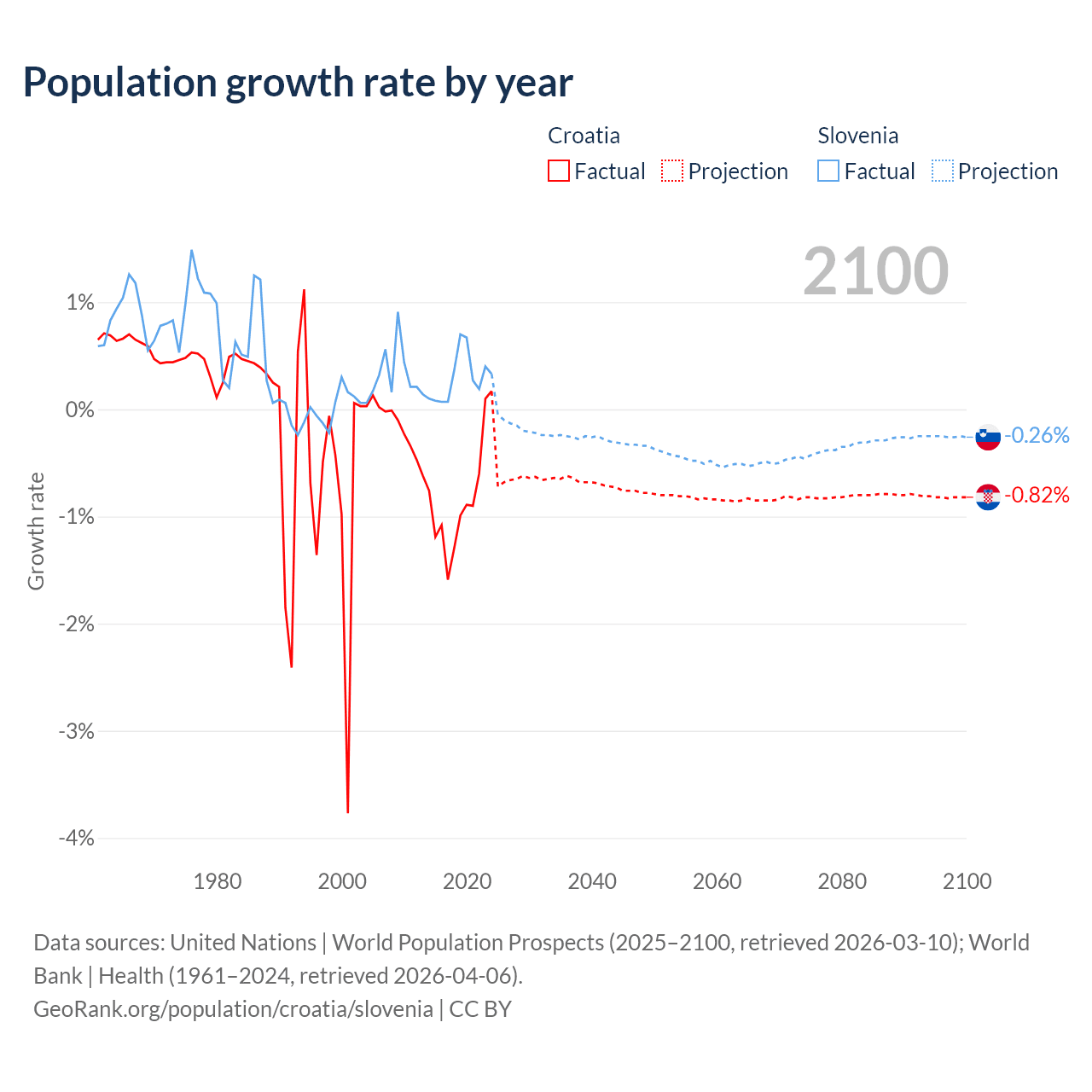 - For the last 10 years, Croatia has had an average growth rate of -0.82% per year vs +0.29% in Slovenia.