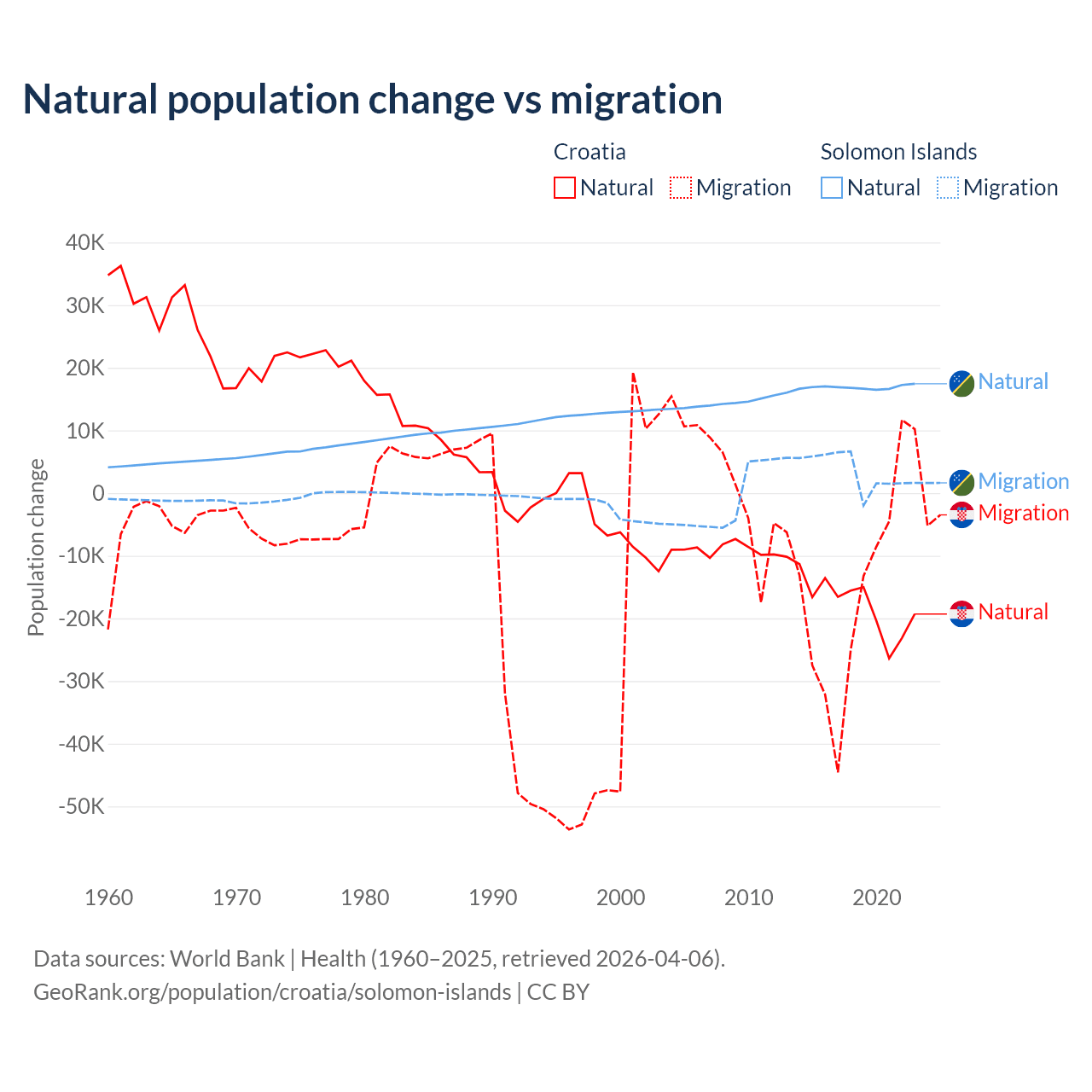 Over the last 10 years, 54.8% of the population change in Croatia is from natural causes (a loss of 177,803 people) and 45.2% is from migration (a loss of 146,770 people). In the Solomon Islands 82.8% is from natural causes (a gain of 168,727 people) and 17.2% is from migration (a gain of 35,031 people).