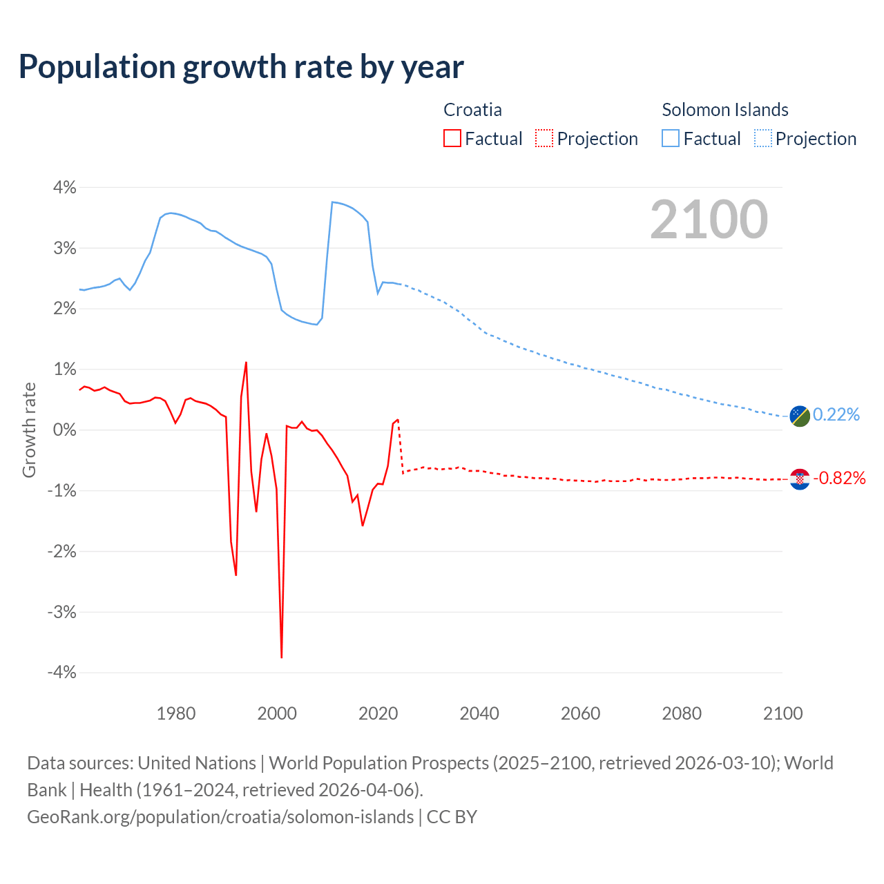 - For the last 10 years, Croatia has had an average growth rate of -0.82% per year vs +2.95% in the Solomon Islands.