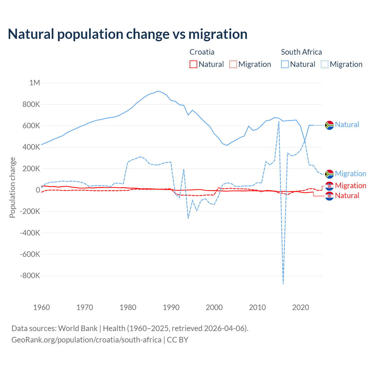 Over the last 10 years, 54.8% of the population change in Croatia is from natural causes (a loss of 177,803 people) and 45.2% is from migration (a loss of 146,770 people). In South Africa 72.8% is from natural causes (a gain of 6,190,027 people) and 27.2% is from migration (a gain of 2,316,795 people).