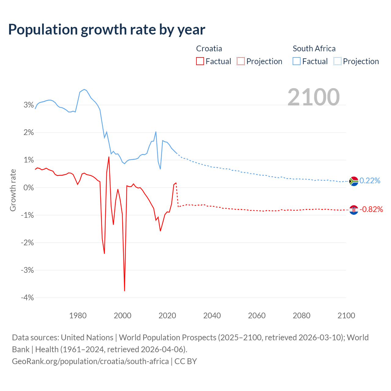 Data sources: World Bank | Health (1960–2024, retrieved 2026-04-06); United Nations | World Population Prospects (1960–2026, retrieved 2026-03-10); U.S. Census Bureau (1960–2025, retrieved 2026-02-08); Central Intelligence Agency (CIA) (2000–2019, retrieved 2026-02-20).
