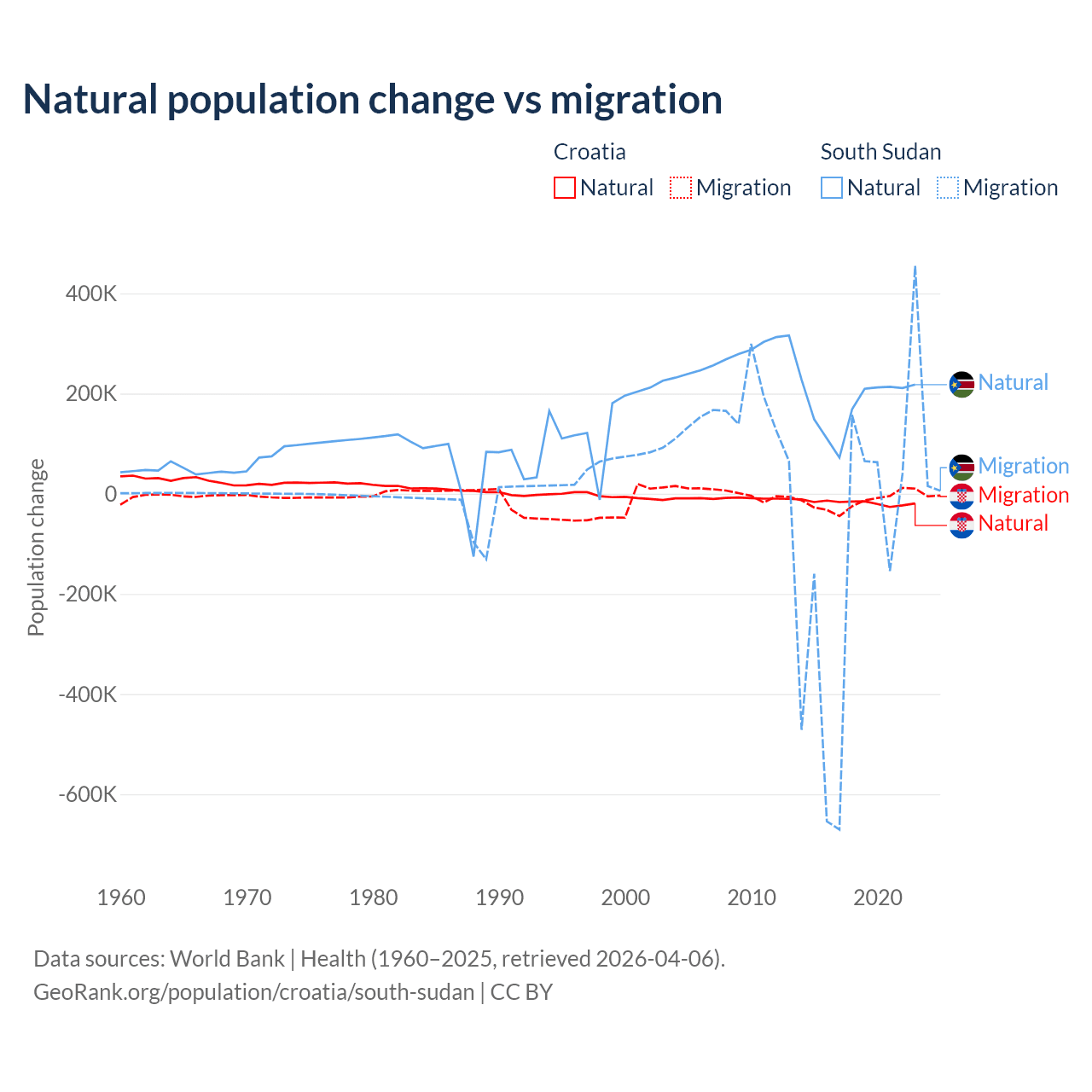 Over the last 10 years, 54.8% of the population change in Croatia is from natural causes (a loss of 177,803 people) and 45.2% is from migration (a loss of 146,770 people). In South Sudan 57.4% is from natural causes (a gain of 1,792,135 people) and 42.6% is from migration (a loss of 1,329,606 people).