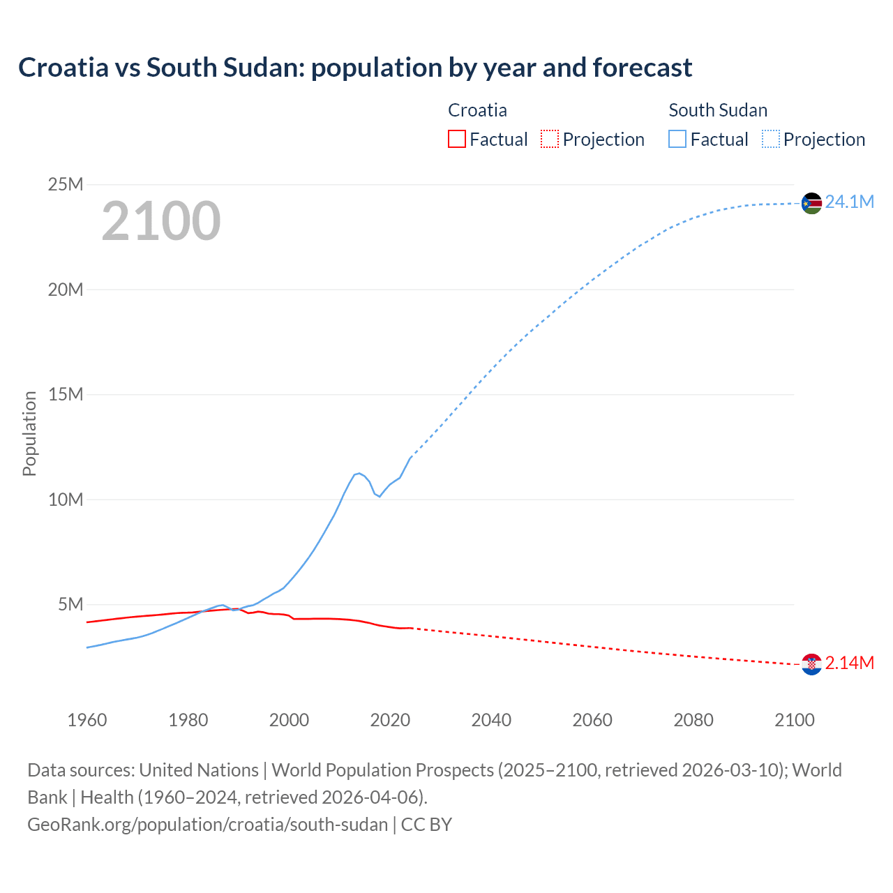 The latest officially reported population of Croatia was 3,866,200 in 2024 vs 11,943,408 people in South Sudan in 2024. In 2026, based on the adjusted UN estimation, the current Croatia's population is 3,812,193 people compared to 12,507,858 in South Sudan.