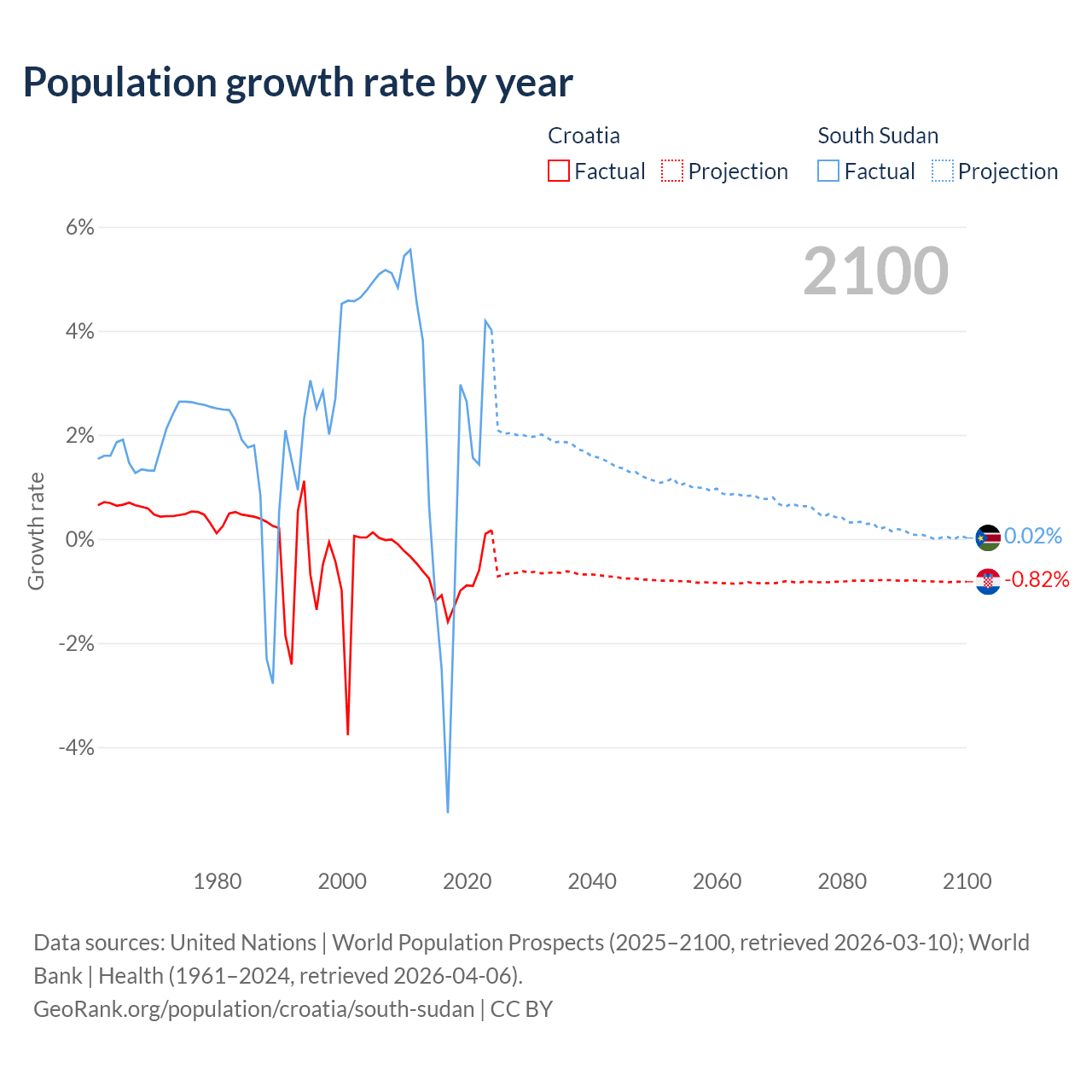 - For the last 10 years, Croatia has had an average growth rate of -0.82% per year vs +0.65% in South Sudan.