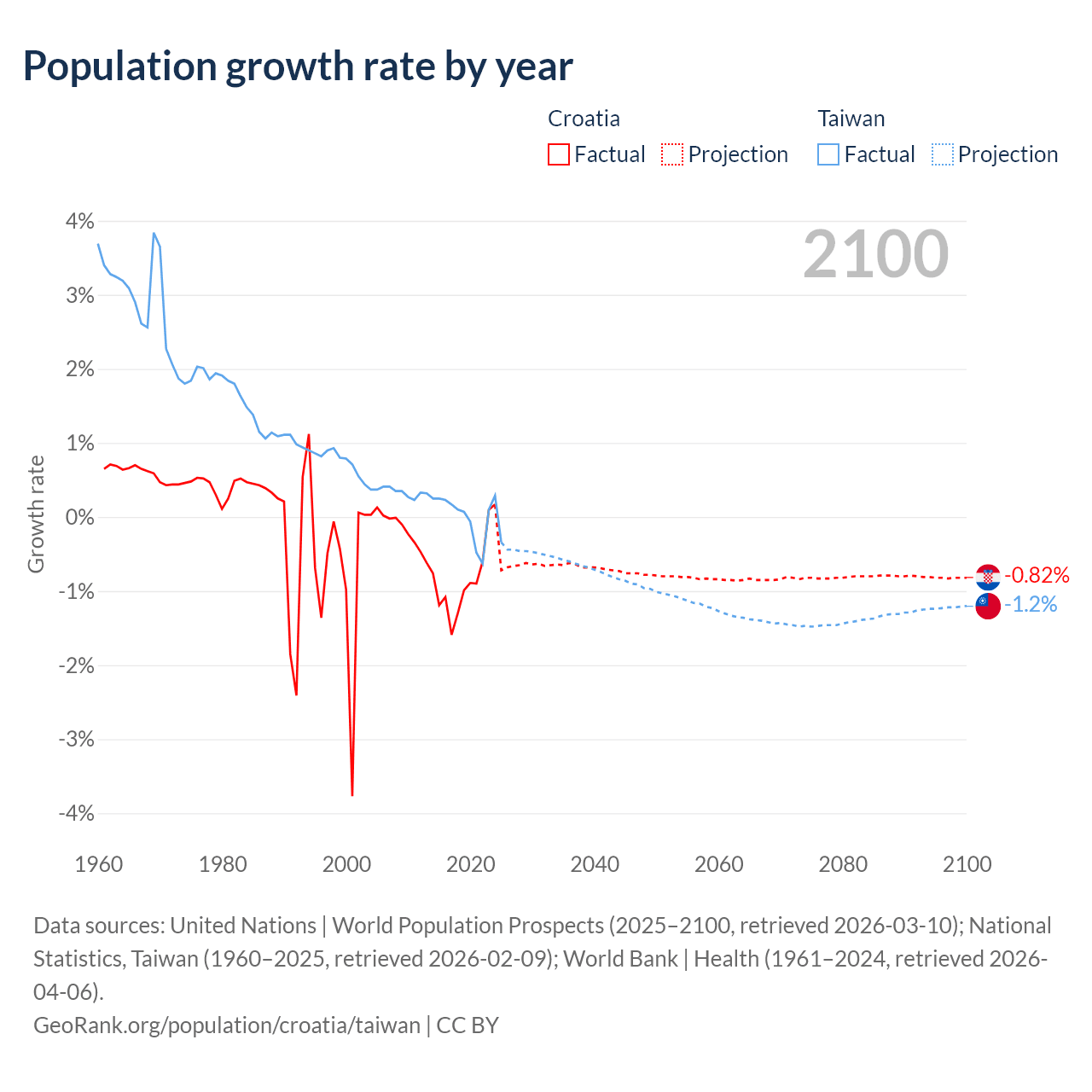 - For the last 10 years, Croatia has had an average growth rate of -0.82% per year vs -0.03% in Taiwan.