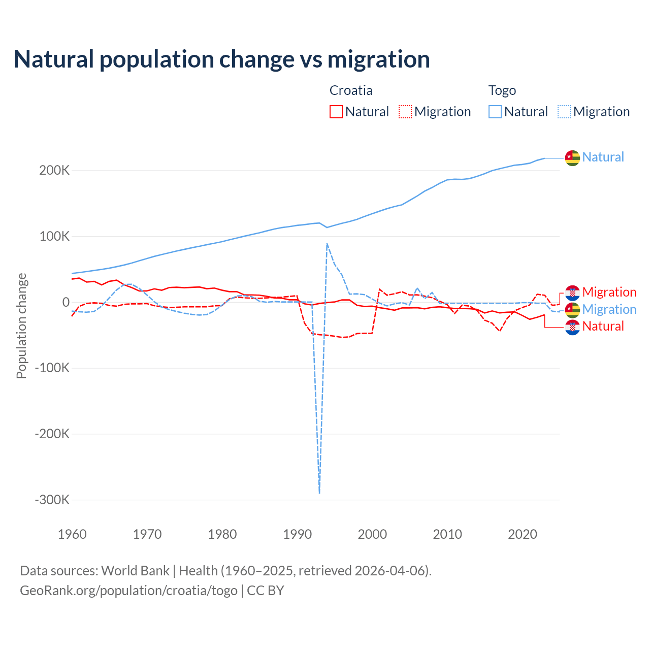 Over the last 10 years, 54.8% of the population change in Croatia is from natural causes (a loss of 177,803 people) and 45.2% is from migration (a loss of 146,770 people). In Togo 99.1% is from natural causes (a gain of 2,052,115 people) and 0.86% is from migration (a loss of 17,852 people).