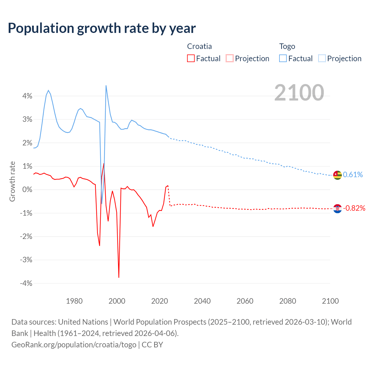 - For the last 10 years, Croatia has had an average growth rate of -0.82% per year vs +2.46% in Togo.