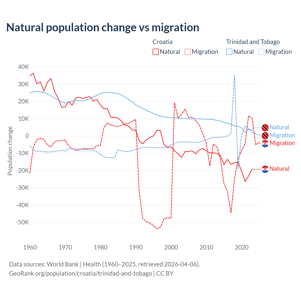 Over the last 10 years, 54.8% of the population change in Croatia is from natural causes (a loss of 177,803 people) and 45.2% is from migration (a loss of 146,770 people). In Trinidad and Tobago 66% is from natural causes (a gain of 55,887 people) and 34% is from migration (a gain of 28,785 people).