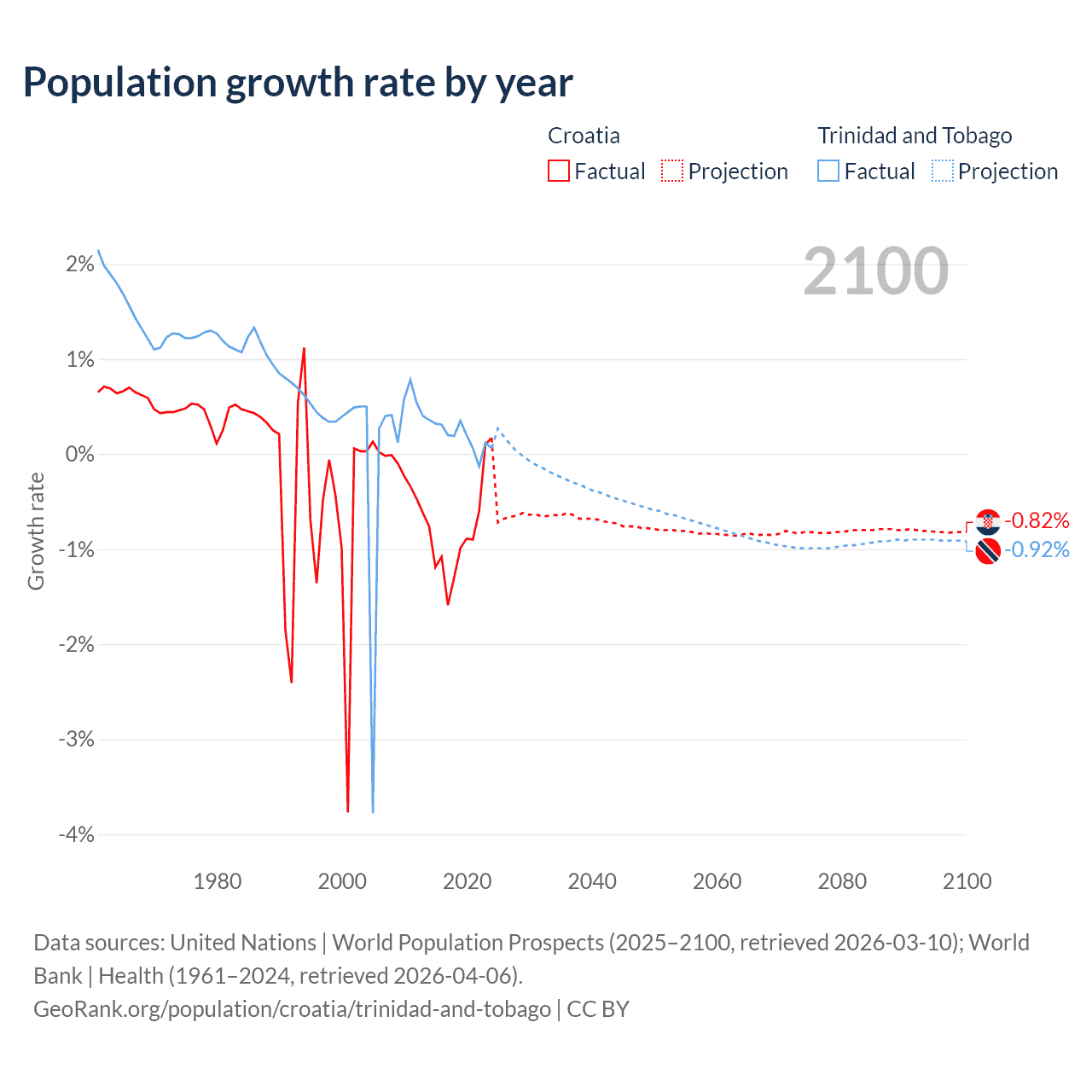 - For the last 10 years, Croatia has had an average growth rate of -0.82% per year vs +0.19% in Trinidad and Tobago.