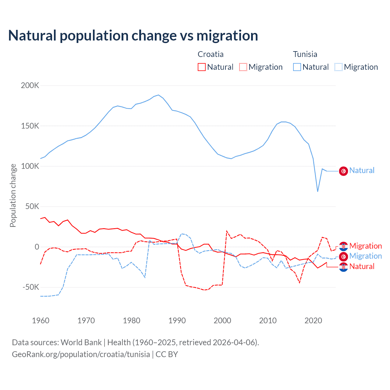 Over the last 10 years, 54.8% of the population change in Croatia is from natural causes (a loss of 177,803 people) and 45.2% is from migration (a loss of 146,770 people). In Tunisia 86.3% is from natural causes (a gain of 1,225,079 people) and 13.7% is from migration (a loss of 195,011 people).