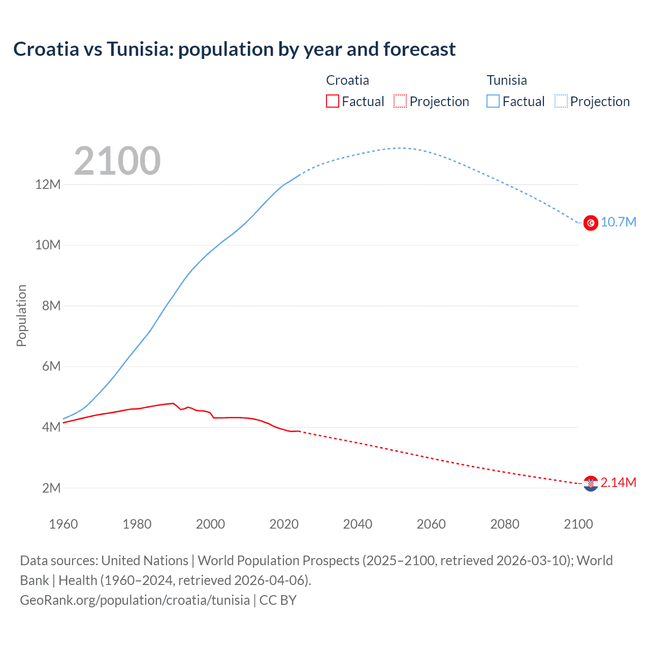 The latest officially reported population of Croatia was 3,866,200 in 2024 vs 12,277,109 people in Tunisia in 2024. In 2026, based on the adjusted UN estimation, the current Croatia's population is 3,812,193 people compared to 12,437,803 in Tunisia.