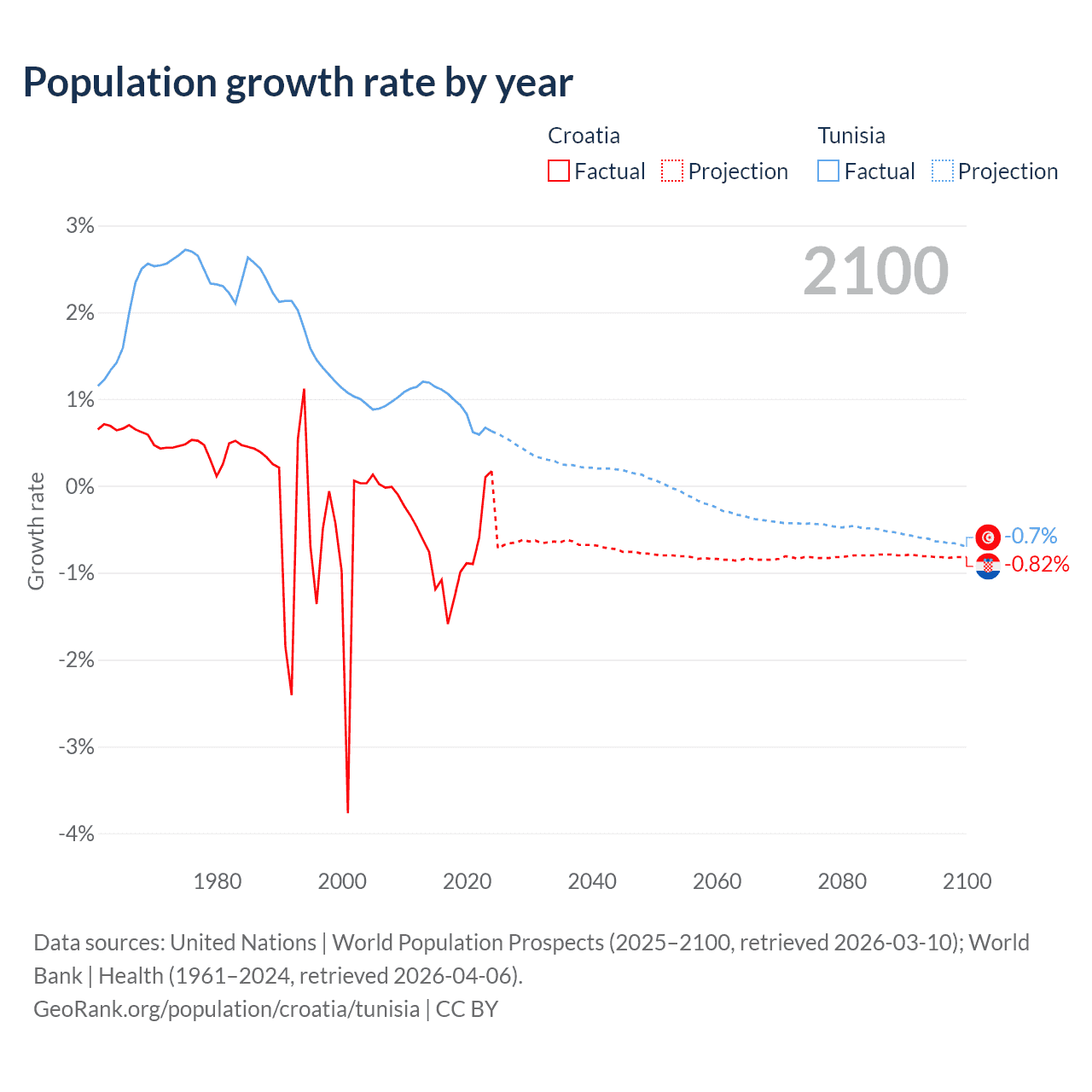 - For the last 10 years, Croatia has had an average growth rate of -0.82% per year vs +0.89% in Tunisia.