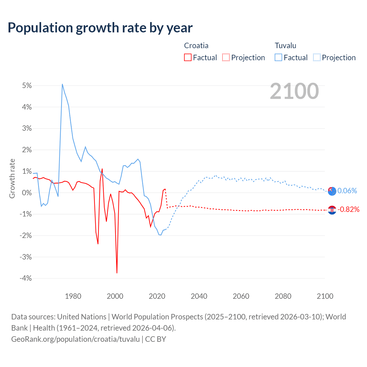 - For the last 10 years, Croatia has had an average growth rate of -0.82% per year vs -1.19% in Tuvalu.