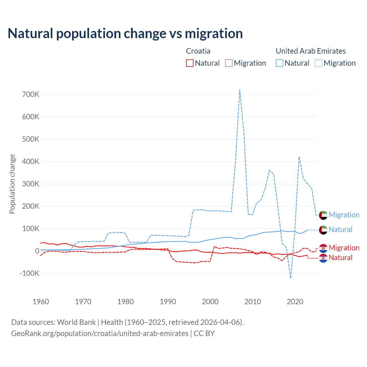 Over the last 10 years, 54.8% of the population change in Croatia is from natural causes (a loss of 177,803 people) and 45.2% is from migration (a loss of 146,770 people). In the United Arab Emirates 30.5% is from natural causes (a gain of 857,996 people) and 69.5% is from migration (a gain of 1,958,520 people).