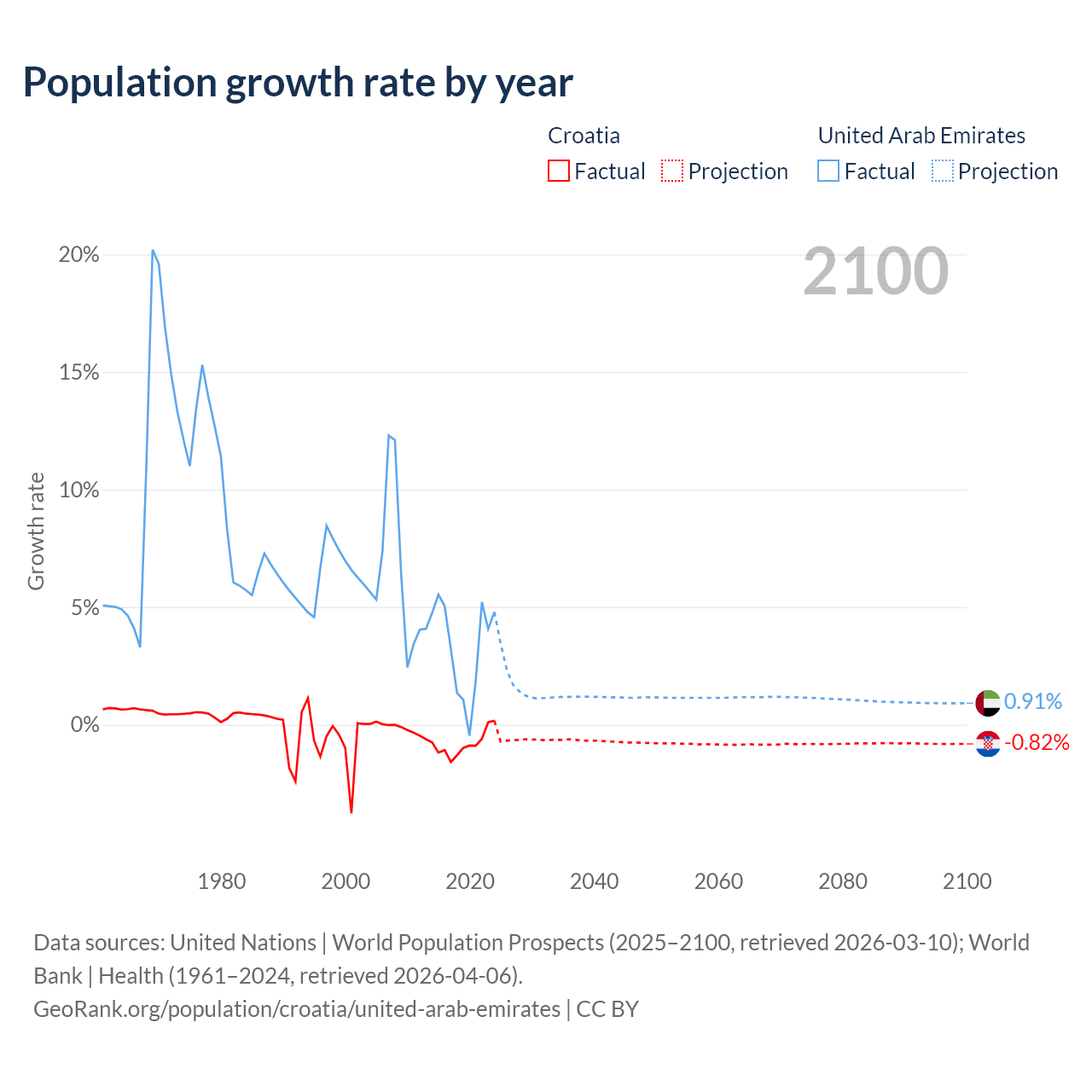 - For the last 10 years, Croatia has had an average growth rate of -0.82% per year vs +3.31% in the United Arab Emirates.