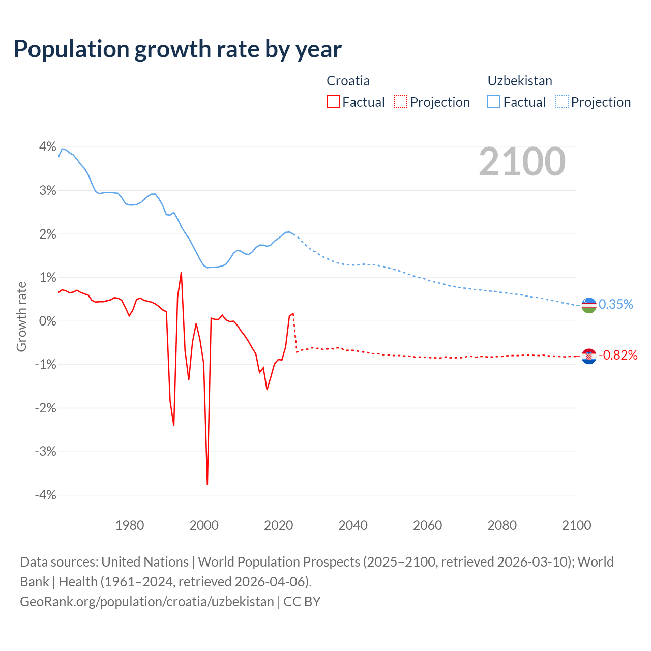 - For the last 10 years, Croatia has had an average growth rate of -0.82% per year vs +1.85% in Uzbekistan.