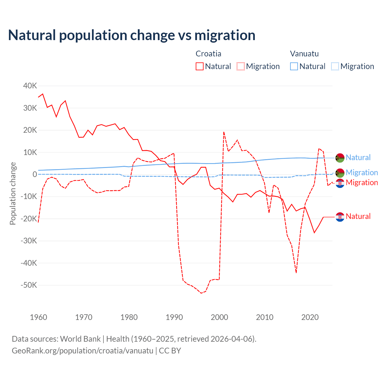 Over the last 10 years, 54.8% of the population change in Croatia is from natural causes (a loss of 177,803 people) and 45.2% is from migration (a loss of 146,770 people). In Vanuatu 92.2% is from natural causes (a gain of 72,941 people) and 7.81% is from migration (a loss of 6,181 people).