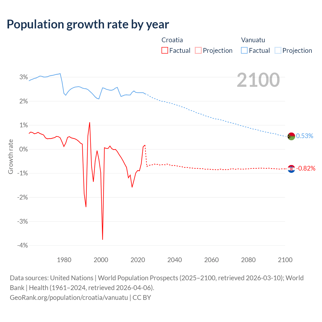 - For the last 10 years, Croatia has had an average growth rate of -0.82% per year vs +2.33% in Vanuatu.